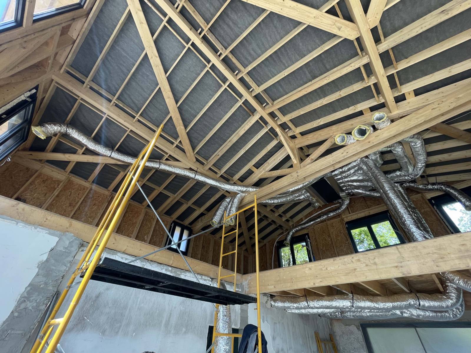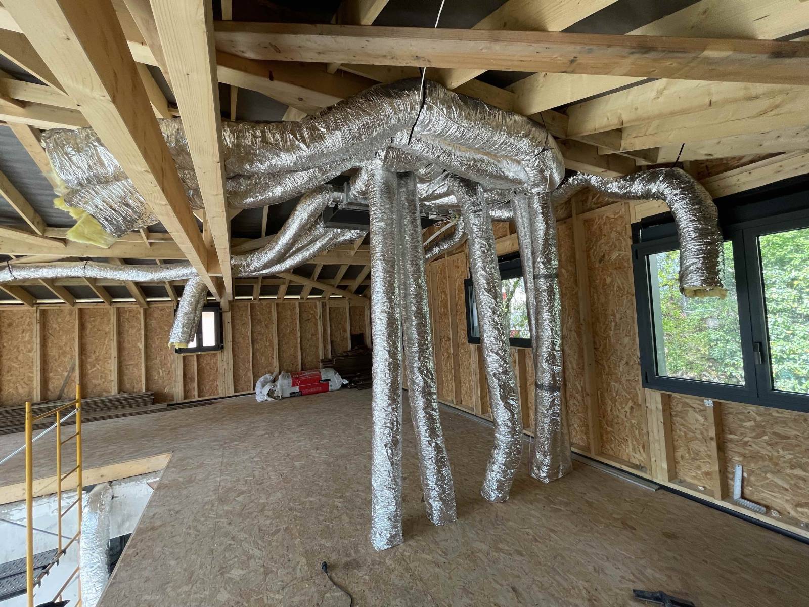 Les gaines souples du gainable Mitsubishi lui permettent de se glisser entre deux cloisons comme il sera le cas sur la photo de l'étage ou au dessus des plafonds. Aucun passage ne leur résiste. Au final, plus rien ne sera visible.