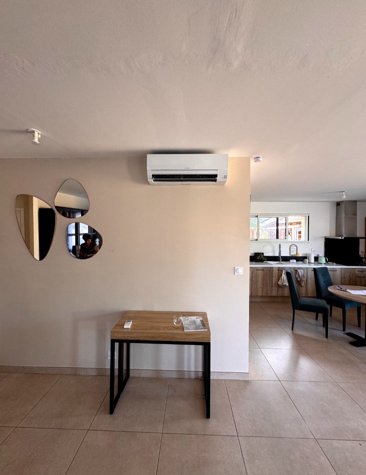 Après une étude personnalisée de la maison, nous avons conseillé et installé une climatisation Mitsubishi mono-split dans le salon, pièce principale de vie. L’unité intérieure a été positionnée de manière optimale pour diffuser l’air frais de façon homogène dans tout l’espace.