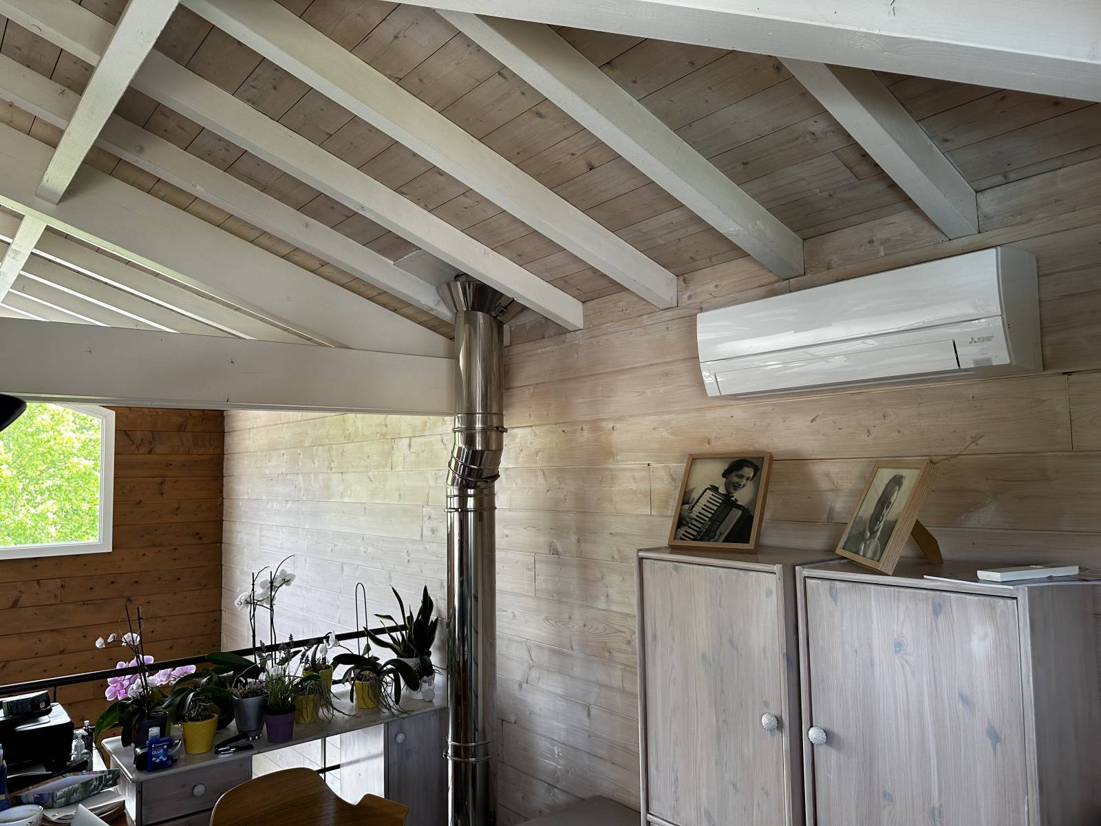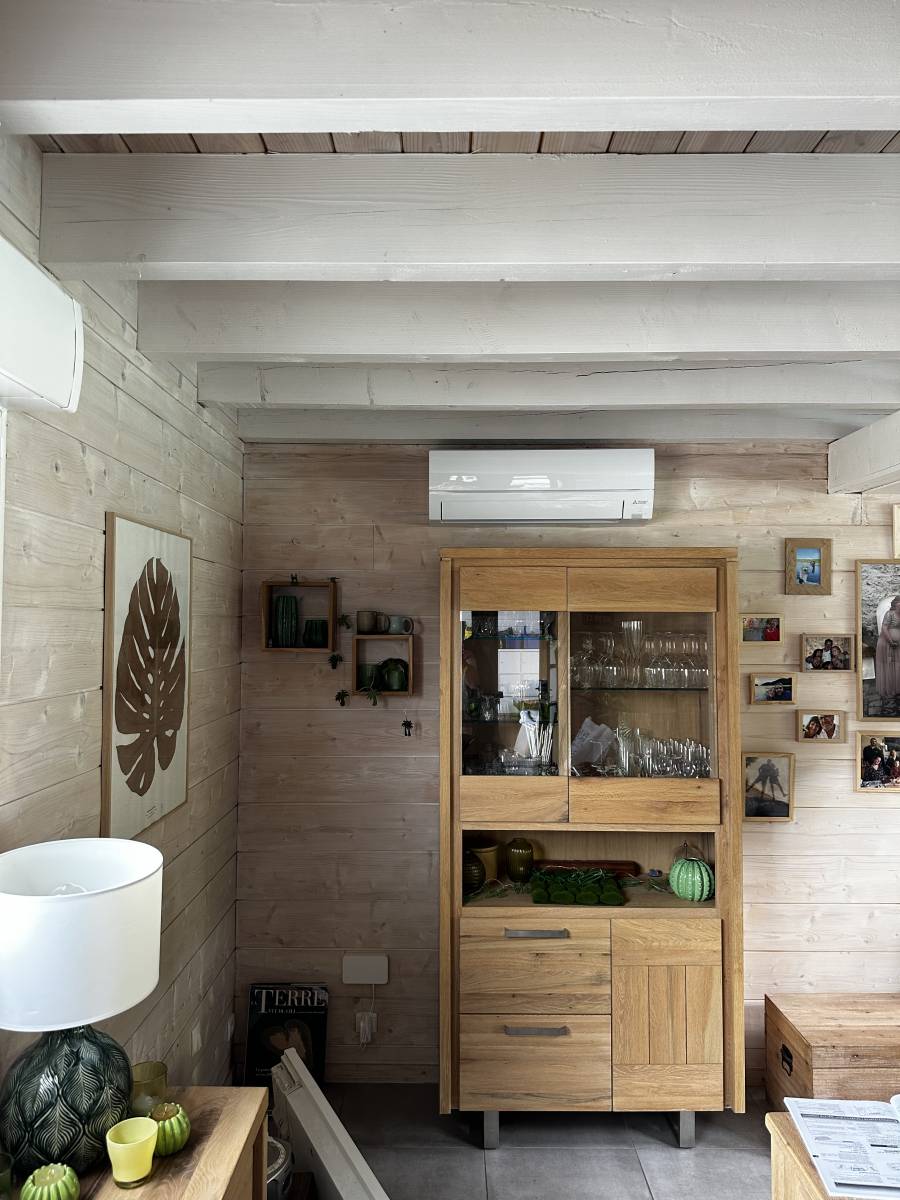 C’est aussi pour cela que nous avons choisi de poser deux pompes à chaleurs air-air dans le salon. Le grand volume d’air à brasser aurait forcé notre client à utiliser sa climatisation sur les plus grosses vitesses de ventilation, engendrant donc plus de bruit. Le fait de diviser nous permet de diminuer les vitesses de ventilation tout en ayant un meilleur brassage.